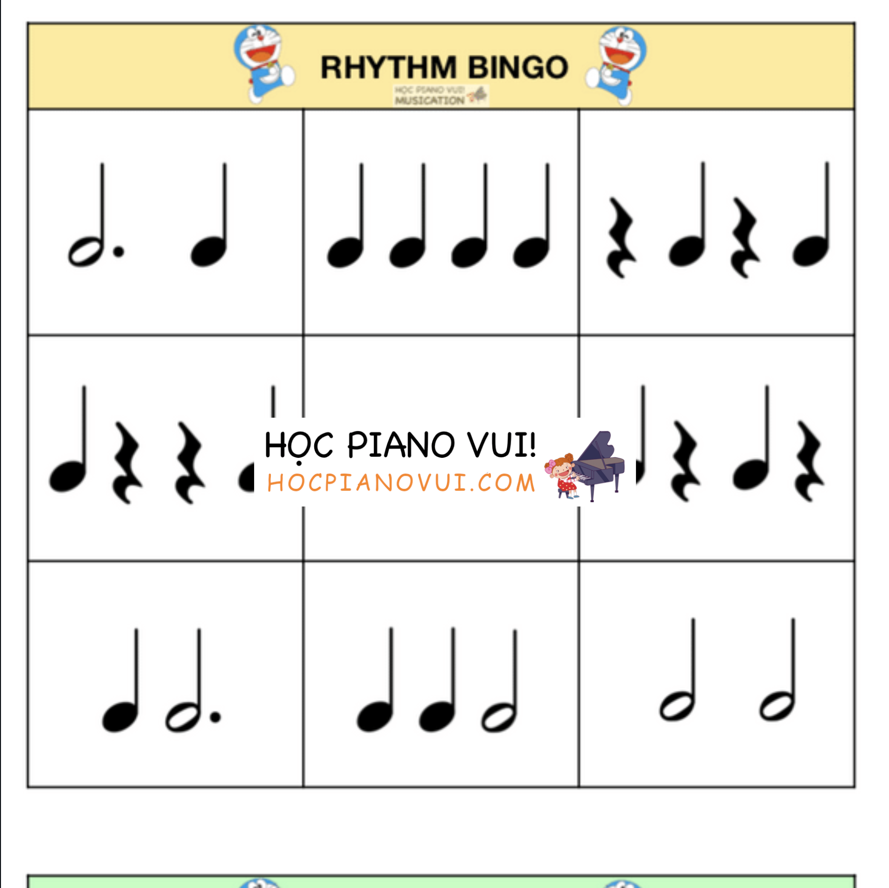 Thẻ Bingo hình Doraemon dễ thương giúp trẻ hứng thú hơn trong việc học tiết tấu.